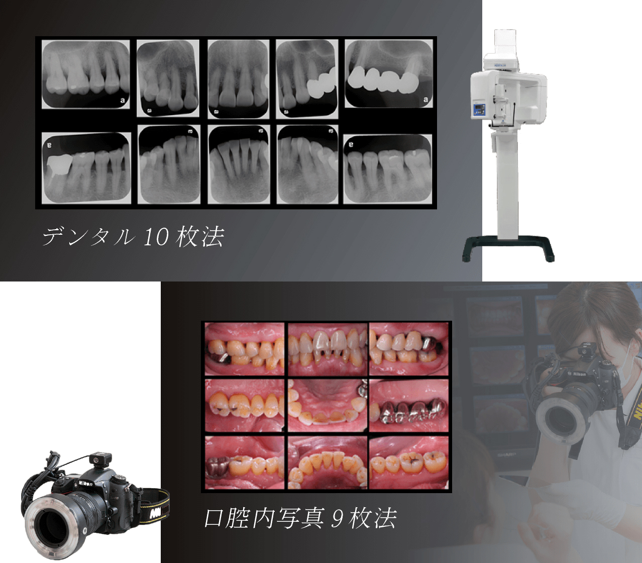 当院では初診の患者さんすべてに口腔内写真法を、全顎的な治療になる患者さんすべてにデンタル10枚法を撮影しています。